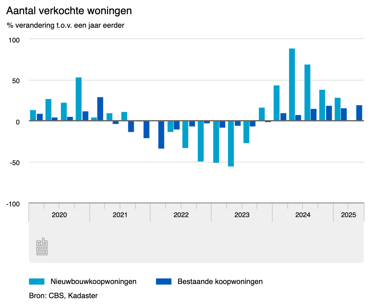 In totaal werden er ruim 57 duizend bestaande koopwoningen verkocht in het tweede kwartaal van 2025. Dit is bijna 20 procent meer dan in het tweede kwartaal van 2024. Er werden bijna 6,3 duizend nieuwbouwkoopwoningen verkocht, dit is ongeveer gelijk aan een jaar eerder. De verkoopaantallen voor nieuwbouwkoopwoningen liepen de vorige zes kwartalen op na een periode van grote dalingen in de nieuwbouwverkoop. In totaal zijn er ruim 63 duizend koopwoningen verkocht, 17,5 procent meer dan vorig jaar.