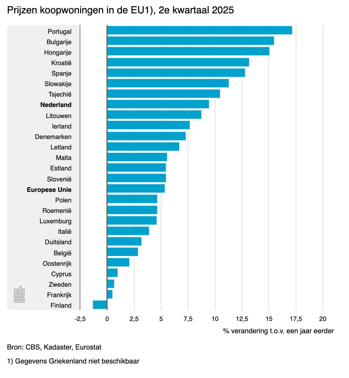 De gemiddelde prijsstijging van nieuwbouw en bestaande bouw samen was in Nederland 9,5 procent ten opzichte van jaar eerder. Hiermee lag de prijsontwikkeling in het tweede kwartaal boven het Europese gemiddelde van 5,4 procent. In zeven EU-landen stegen de huizenprijzen meer dan in Nederland. De grootste stijging in het tweede kwartaal van 2025 was in Portugal: 17,2 procent. Alleen in Finland daalden de huizenprijzen ten opzichte van vorig jaar, met 1,3 procent.