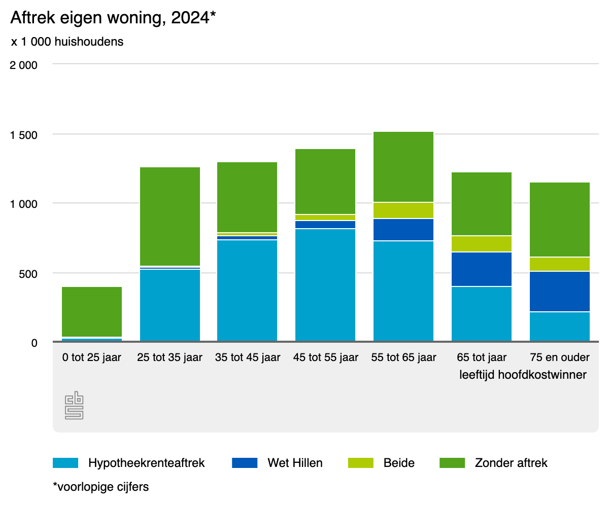 Van de oudste huishoudensgroep gebruikt de helft de aftrek eigen woning. Zij profiteren wel vaker van de Wet Hillen, doordat zij gemiddeld een lagere hypotheekschuld hebben dan jongere huishoudens en vaker hun eigenwoningschuld al hebben afbetaald.