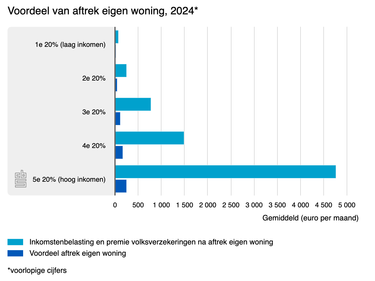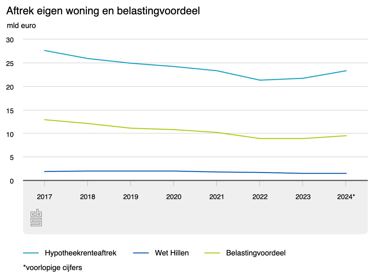 Het belastingvoordeel door de aftrek eigen woning is in 2024 met 0,6 miljard euro gestegen. Daarvoor daalde het jarenlang. Dat kwam door de dalende hypotheekrentes, de afbouw van de hypotheekrenteaftrek en van de Wet Hillen.
