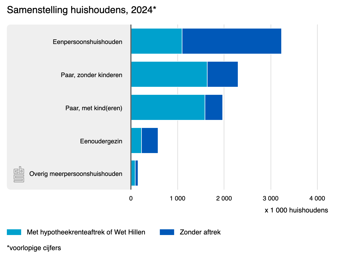 Paren met kinderen bezitten vaker een eigen woning: 81 procent gebruikt de hypotheekrenteaftrek en/of de Wet Hillen, voor in totaal 11,4 miljard euro in 2024. Dit resulteerde in een belastingvoordeel van 4,6 miljard euro. Van de paren zonder kinderen gebruikt 71 procent de aftrek, die 2,8 miljard euro belastingvoordeel oplevert. Eenoudergezinnen (39 procent) en eenpersoonshuishoudens (34 procent) hebben juist het minst vaak voordeel van de fiscale regeling doordat zij minder vaak een eigen woning bezitten. Eenpersoonshuishoudens hebben gemiddeld ook het minste belastingvoordeel van alle groepen. Zij hebben ook gemiddeld lagere inkomens en kleinere hypotheekschulden.