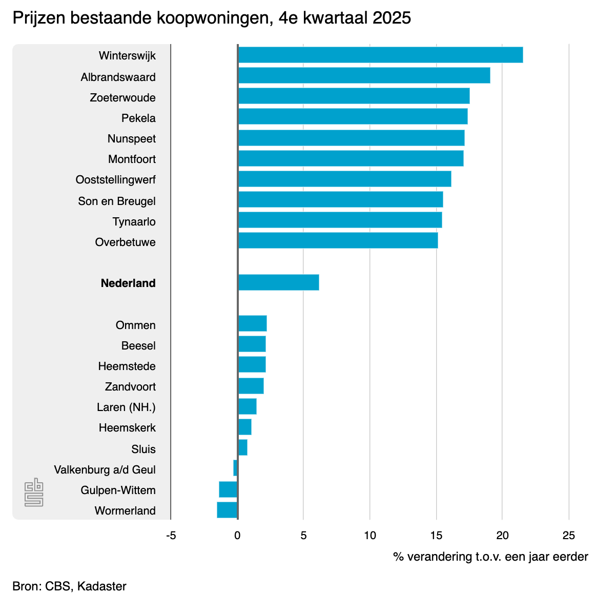 De transactieprijzen van bestaande koopwoningen waren in het vierde kwartaal van 2025 in bijna alle gemeenten hoger dan een jaar eerder. De prijsstijging was het grootst in Winterswijk. In het derde kwartaal was de stijging nog het grootst in Albrandswaard (ZH). Over het algemeen stijgen de huizenprijzen sterker in oostelijke gemeenten dan in het westen. Dit blijkt uit nieuwe analyses van het Centraal Bureau voor de Statistiek (CBS) en het Kadaster.