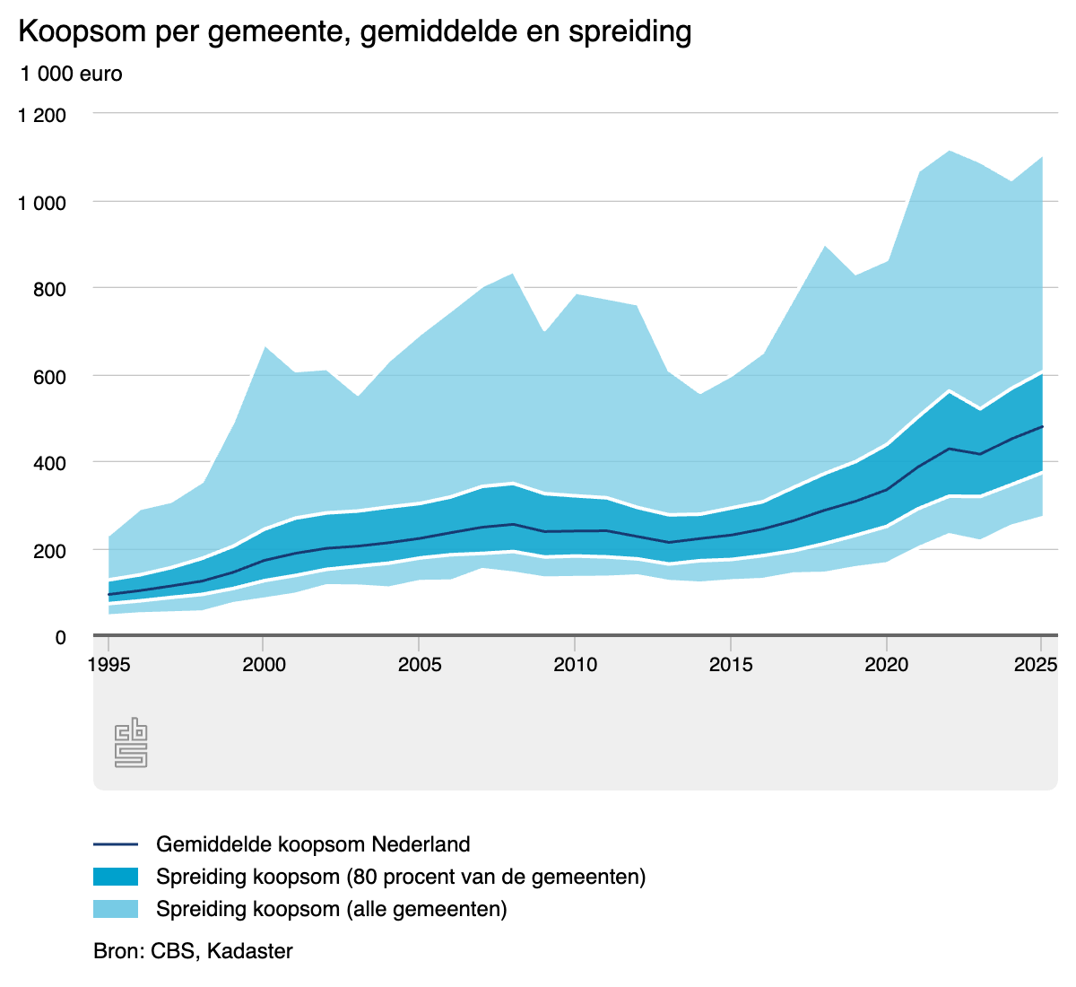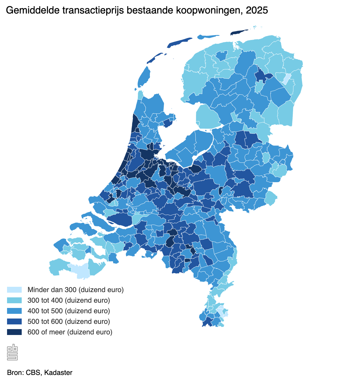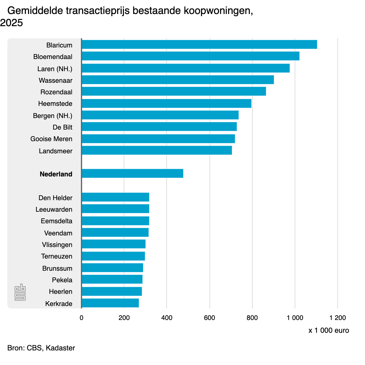 In 2025 was de gemiddelde transactieprijs van een bestaande koopwoning 480 duizend euro. In Blaricum betaalden kopers het meest met gemiddeld 1,1 miljoen euro, en in Kerkrade het minst met gemiddeld 270 duizend euro. In 2 gemeenten is de gemiddelde prijs boven de 1 miljoen euro, in 5 gemeenten is deze lager dan 300 duizend euro. Dit blijkt uit cijfers van het Centraal Bureau voor de Statistiek (CBS) en het Kadaster.
