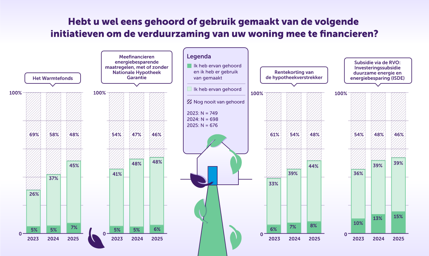 De afbeelding geeft antwoord op de vraag gesteld in 2023 (n=749), 2024 (n=698) en 2025 (n=676) aan hypotheekbezitters: "Hebt u wel eens gehoord of gebruik gemaakt van een van deze 4 initiatieven om de verduurzaming van uw woning mee te financieren?" |